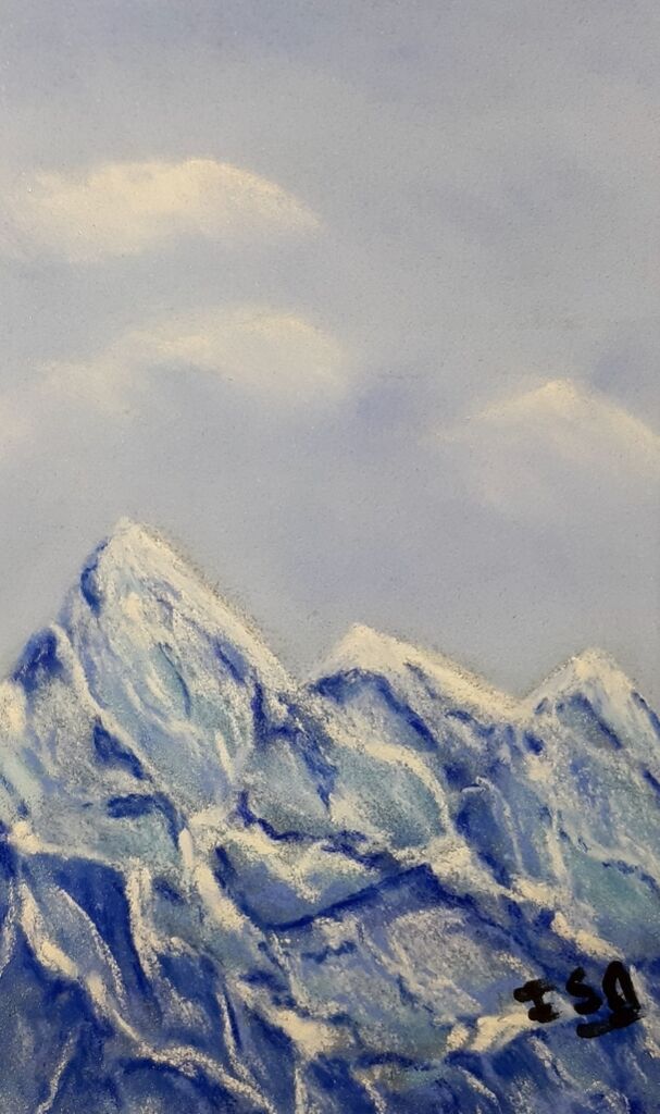 À travers des nuances subtiles et des couleurs métalliques, Isabelle Alberge (Isa) restitue les brillances cristallines qui dansent sur les neiges éternelles. Ses pastels dévoilent une atmosphère où la lumière façonne chaque crête, chaque relief, révélant ainsi la grandeur intemporelle de la montagne.